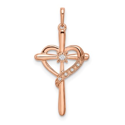 14k Two-tone White and Rose Heart with Cross 1/20 carat Diamond Pendant
