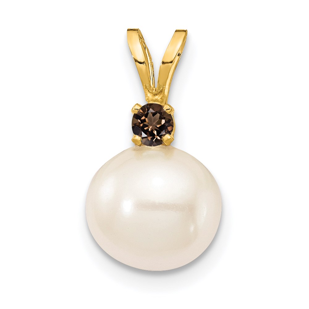 14k 8-8.5mm White Round Freshwater Cultured Pearl and .09SQ Smoky Quartz Pendant