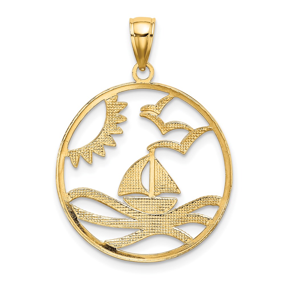 14k and White Rhodium Sun/Sailboat/Water/Seagulls in Circle Charm