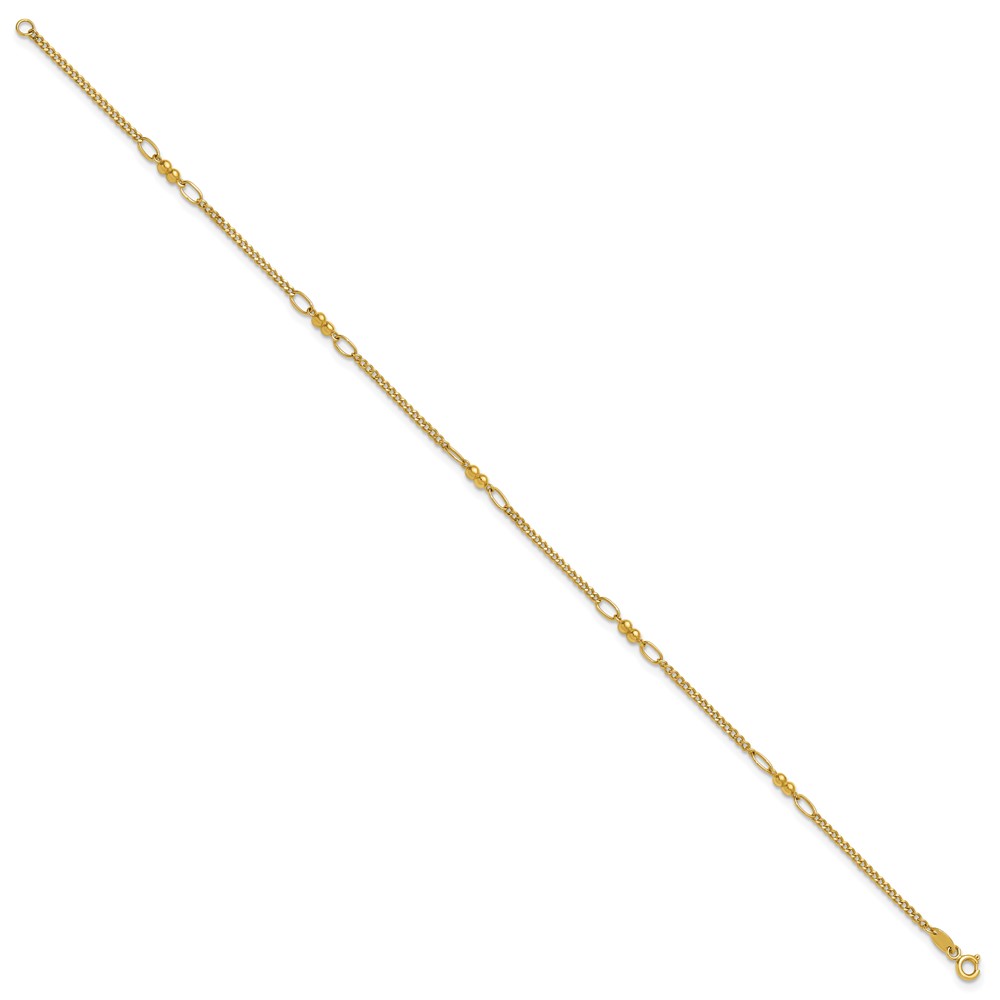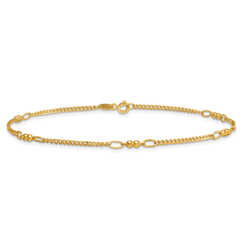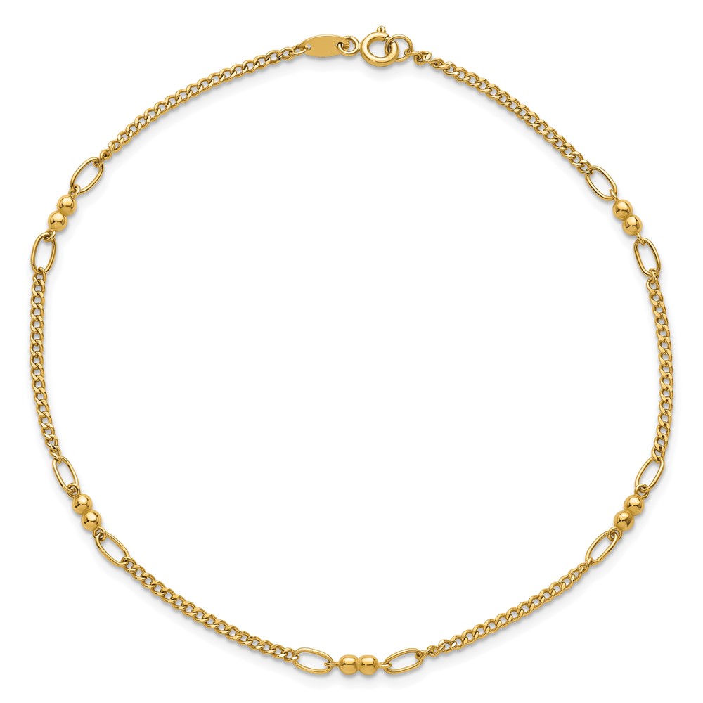 14K Polished and Diamond-cut 5-Station Beaded Mixed Link Anklet
