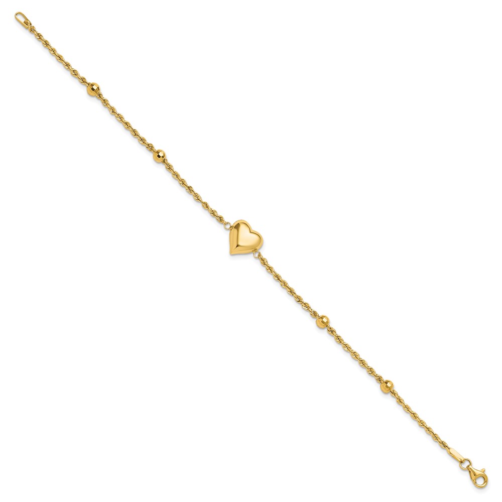 14k Polished and Diamond-cut Beaded Puffed Heart 7.75 inch Bracelet