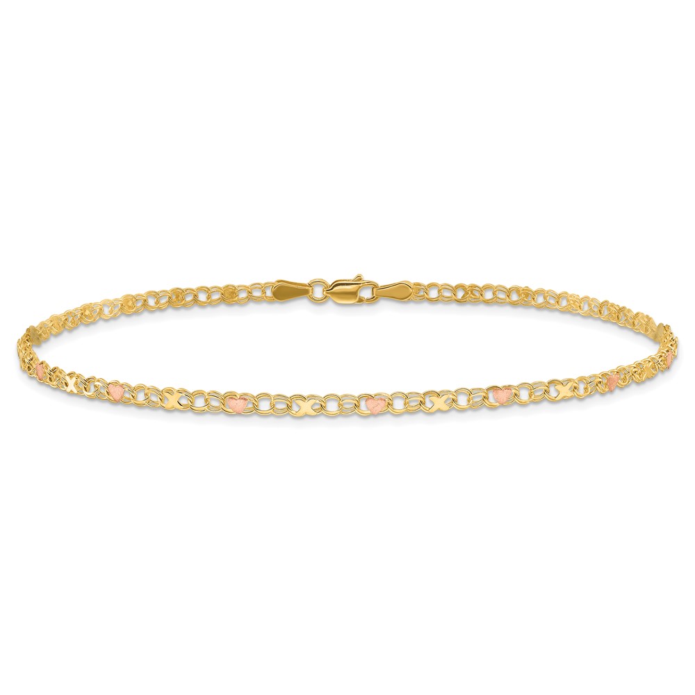 14k Polished and Satin Rose-plated X-and-Heart Anklet