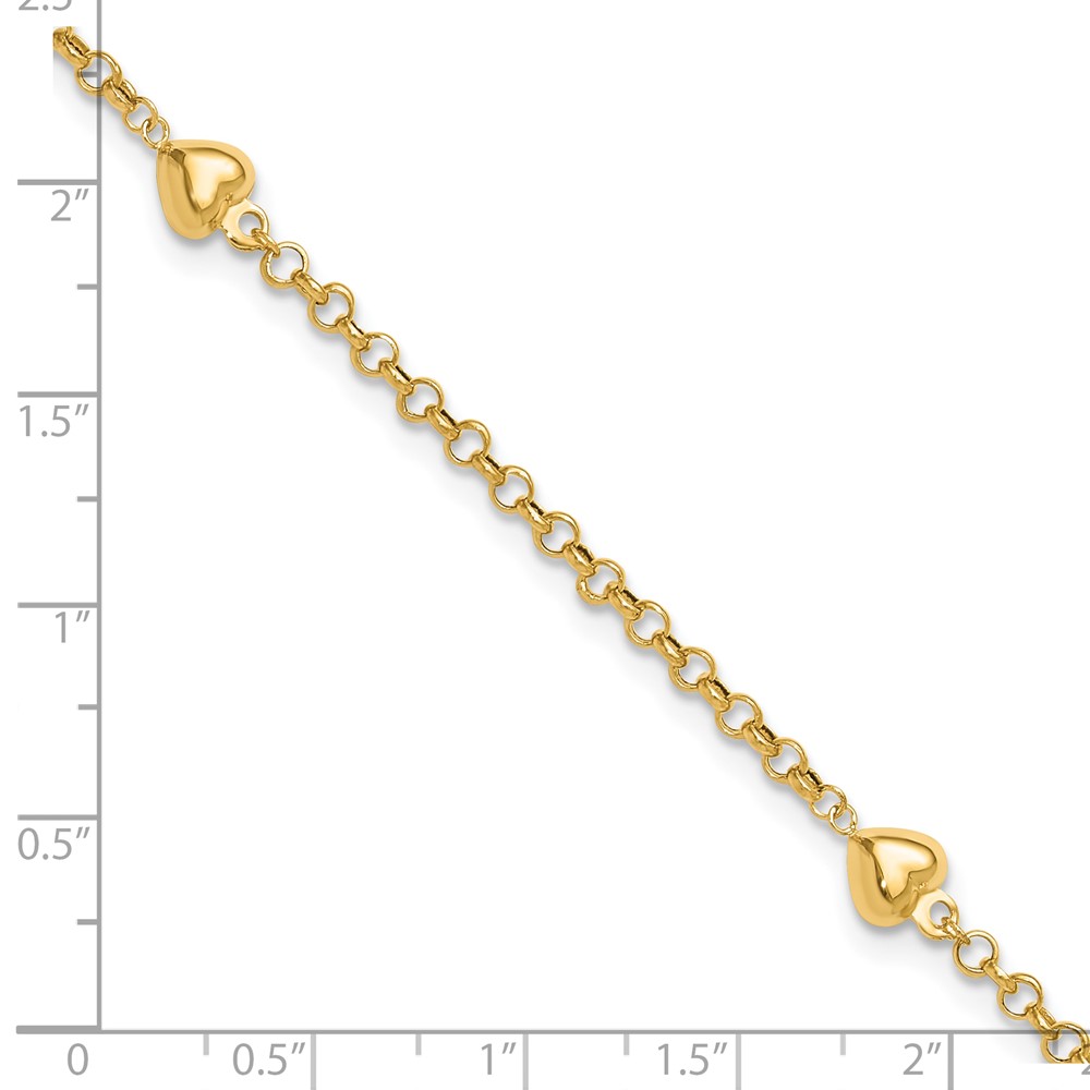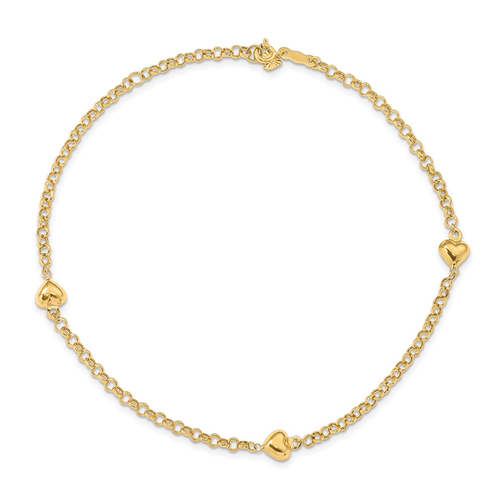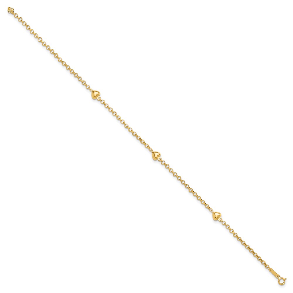 14K Polished Curb Chain with 3 Puffed Heart Dangles Plus Extender – Total Anklet
