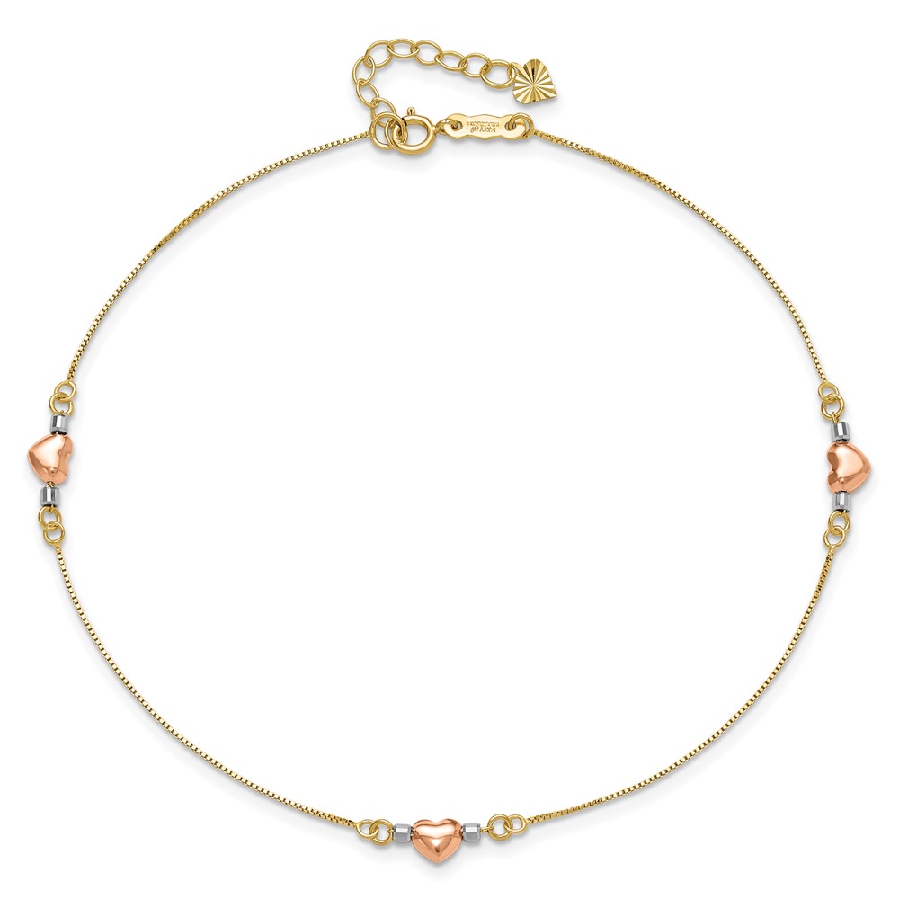 14k Tri-Color Puffed Hearts and Beads Plus Extender – Total Anklet