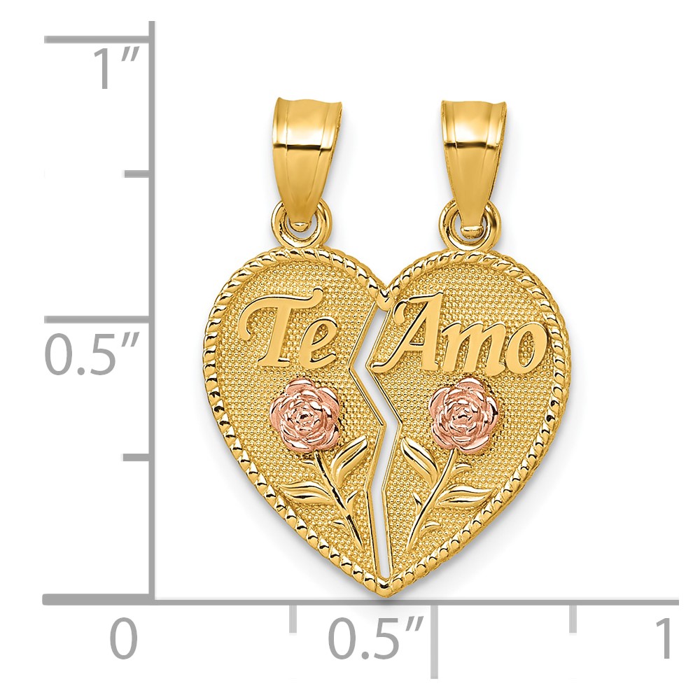 14k Two-tone Polished Break-Apart Heart With TE AMO And Roses Pendant