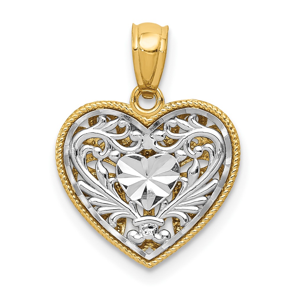 14K Two-tone Polished Diamond-cut Reversible Filigree Heart Pendant