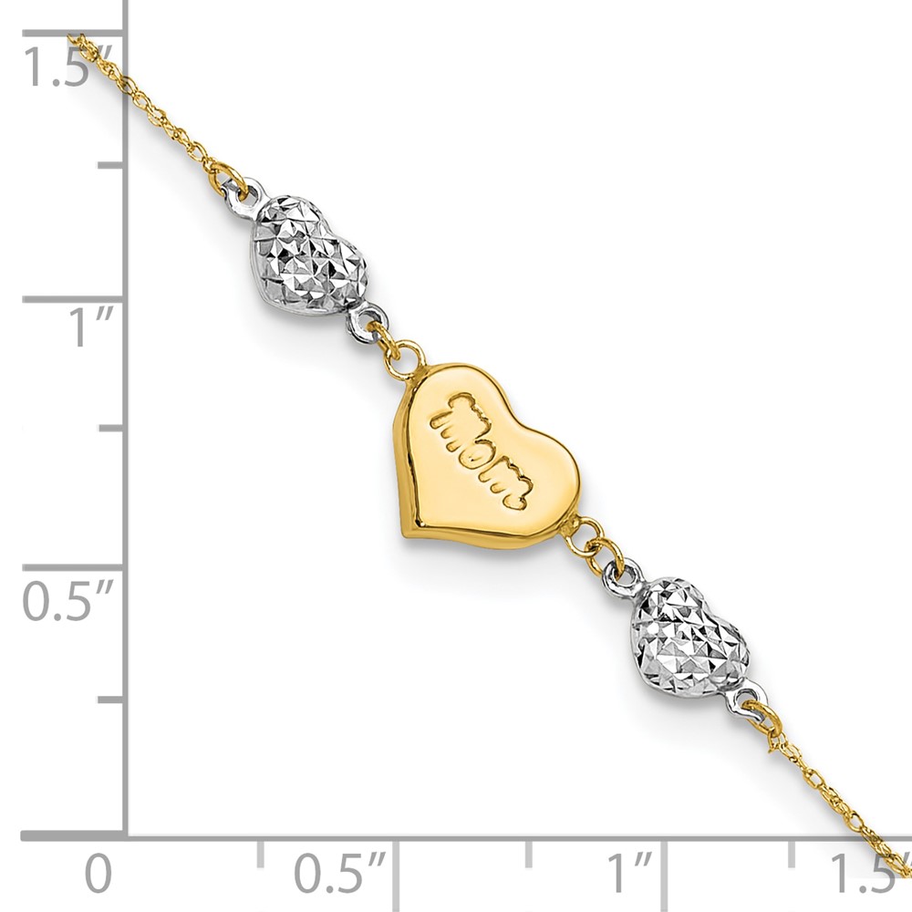 14K Two-tone Puffed MOM Heart and Diamond-cut Beads Bracelet Plus Heart Dangle Extender