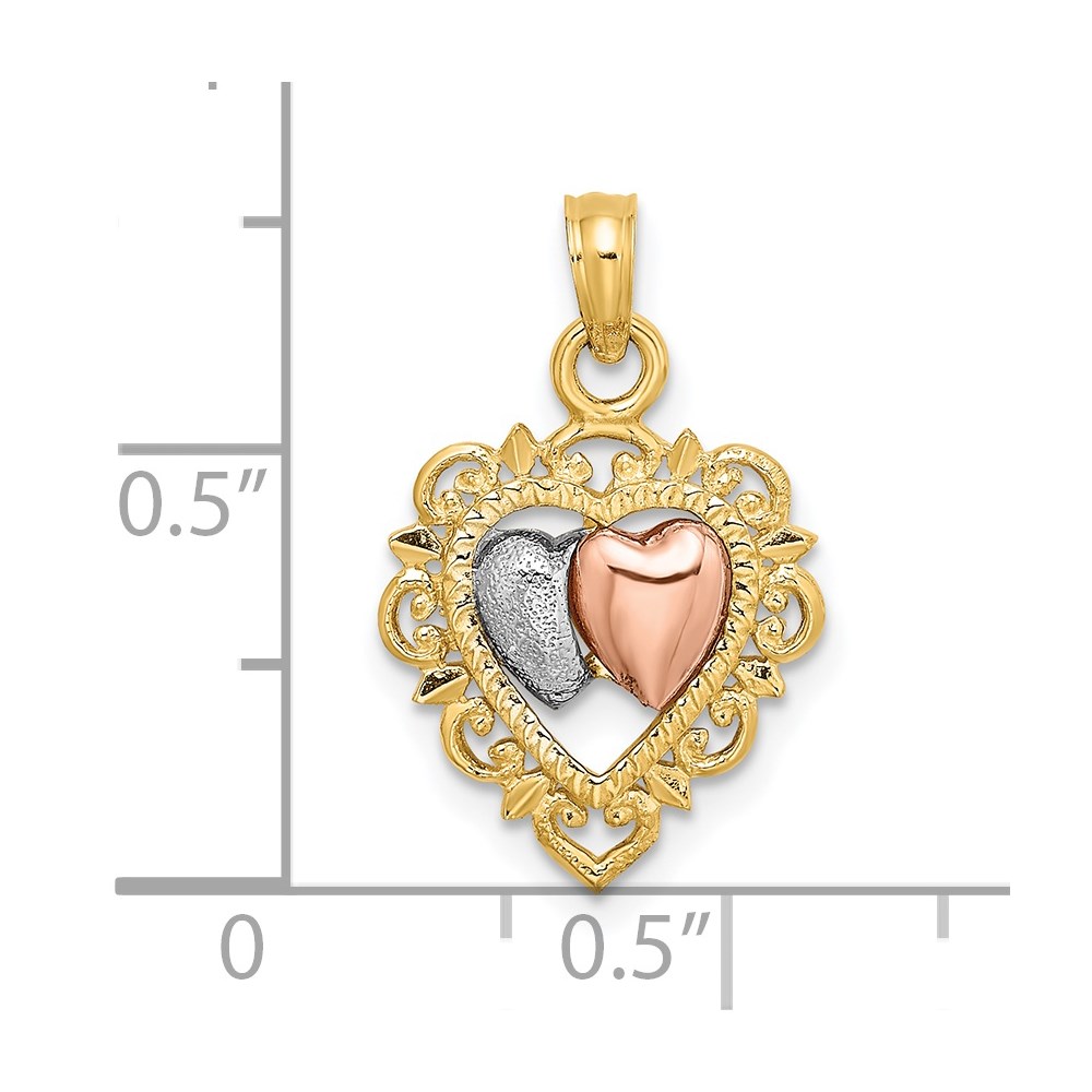 14k Two-tone with White Rhodium Textured Hearts Charm