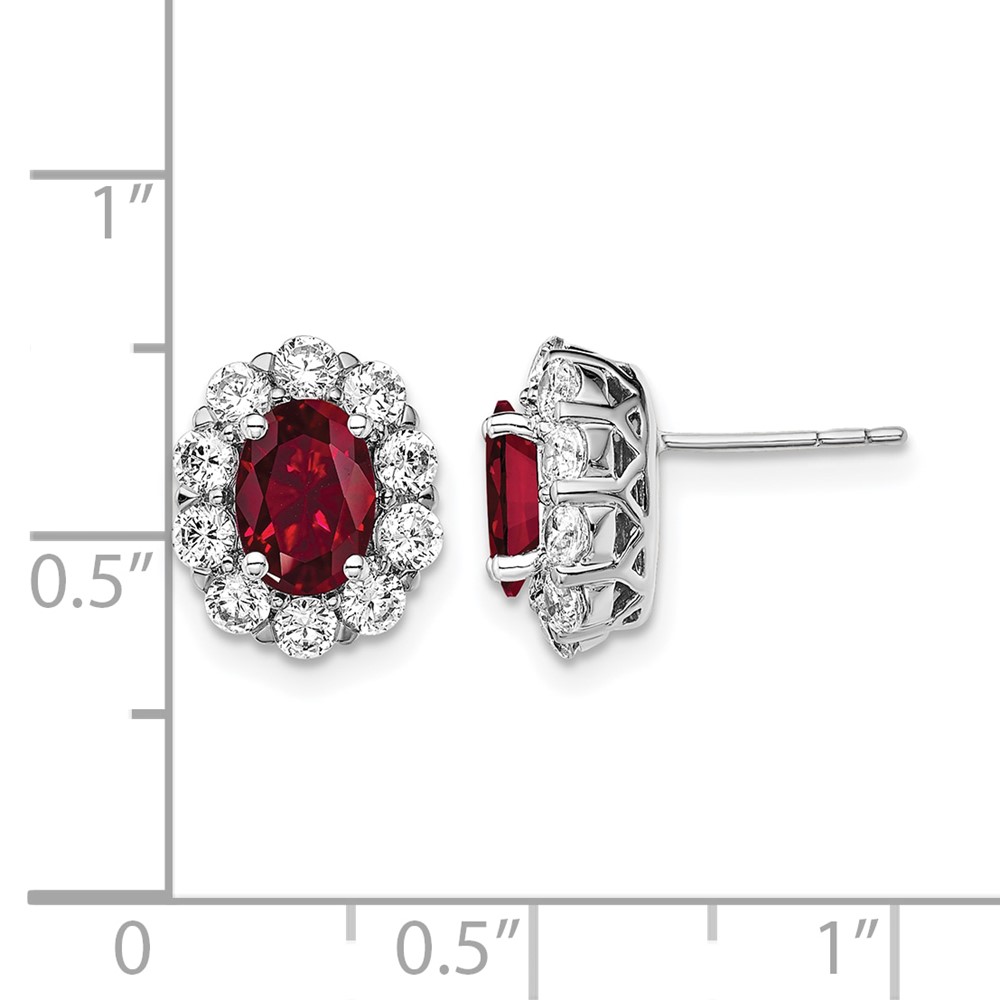 14k White Gold 1 1/5 carat Lab Grown Diamond VS/SI+ G+ and Oval Created Ruby Complete Halo Post Earrings