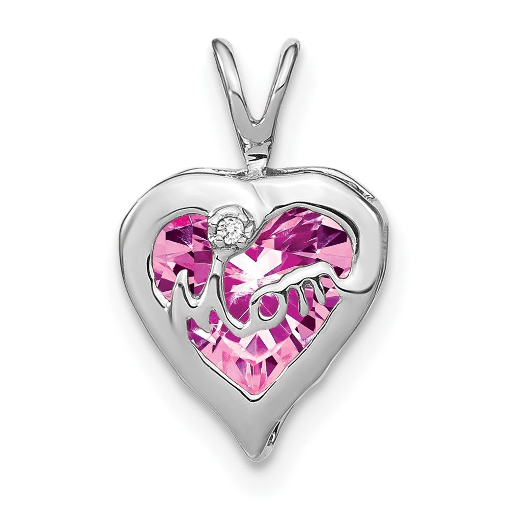 14k White Gold Lab Created Pink Sapphire and Diamond MOM Heart Pendant