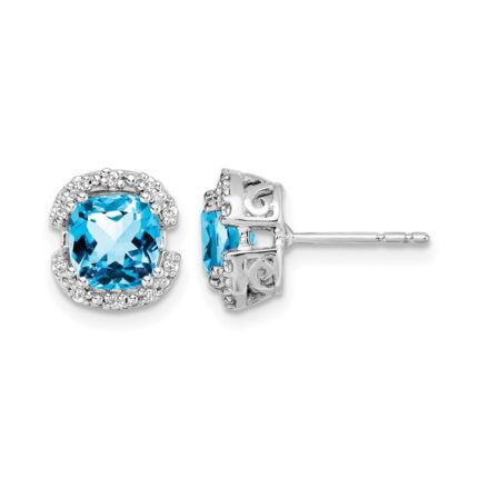 14k White Gold Cushion Blue Topaz and Diamond Halo Earrings