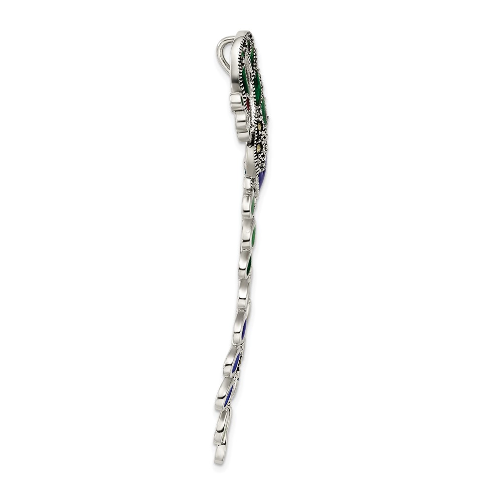 Sterling Silver Antiqued Green/Red/Blue Epoxy Marcasite Peacock Slide