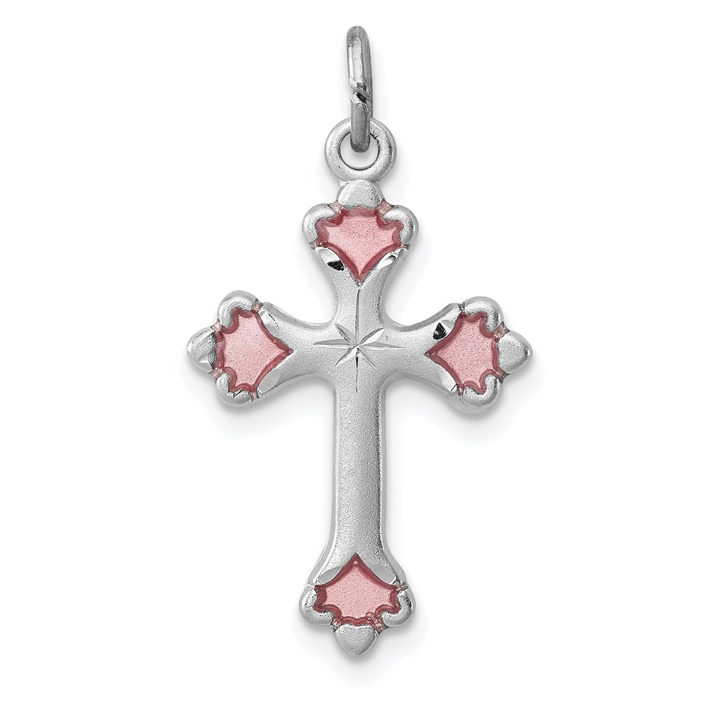 Sterling Silver Platinum-plated Pink Enameled Budded Cross Charm