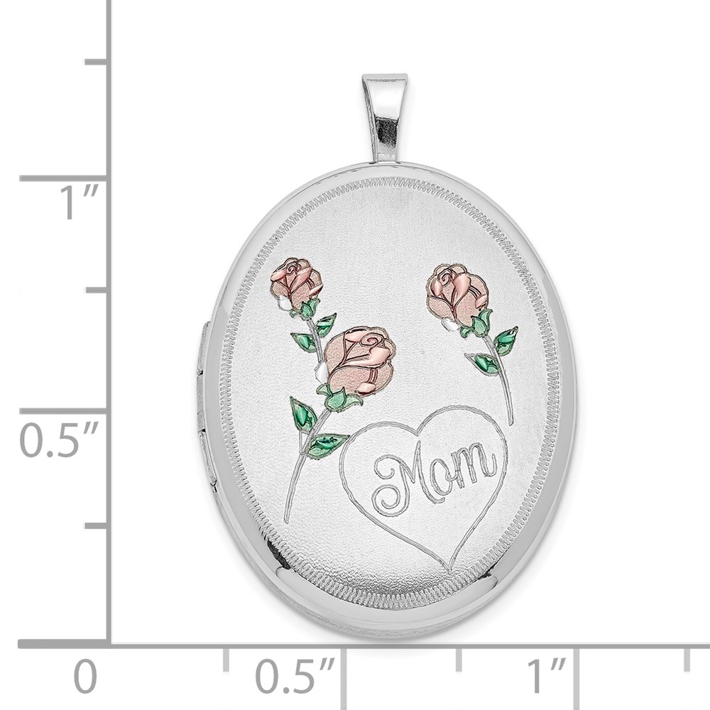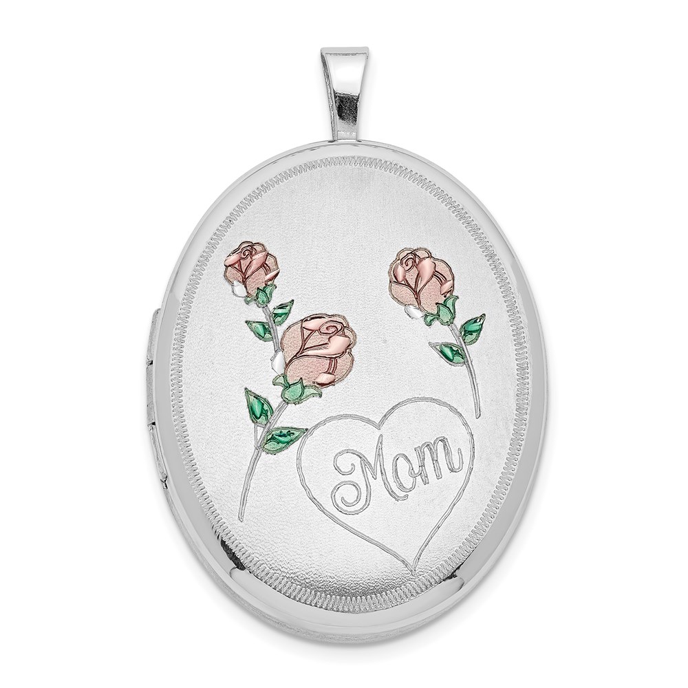 Sterling Silver RH 26mm Satin/Polished Enameled Roses Mom Oval Locket