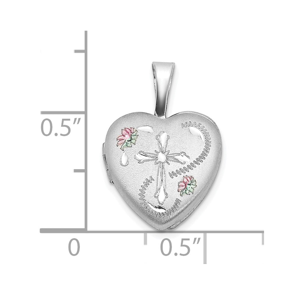 Sterling Silver Rhodium-plated D/C Enameled Floral Cross 12mm Heart Locket