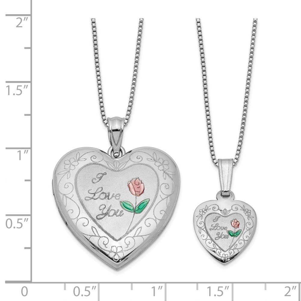 Sterling Silver Rhodium-plated Enameled Polished/Satin Rose I Love You Heart Mom 18in Locket & Daughter 14in Pendant Necklace Set