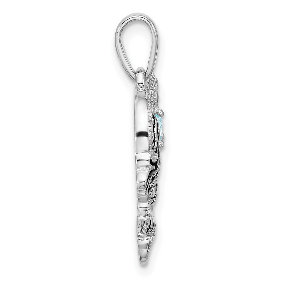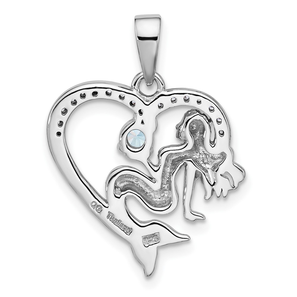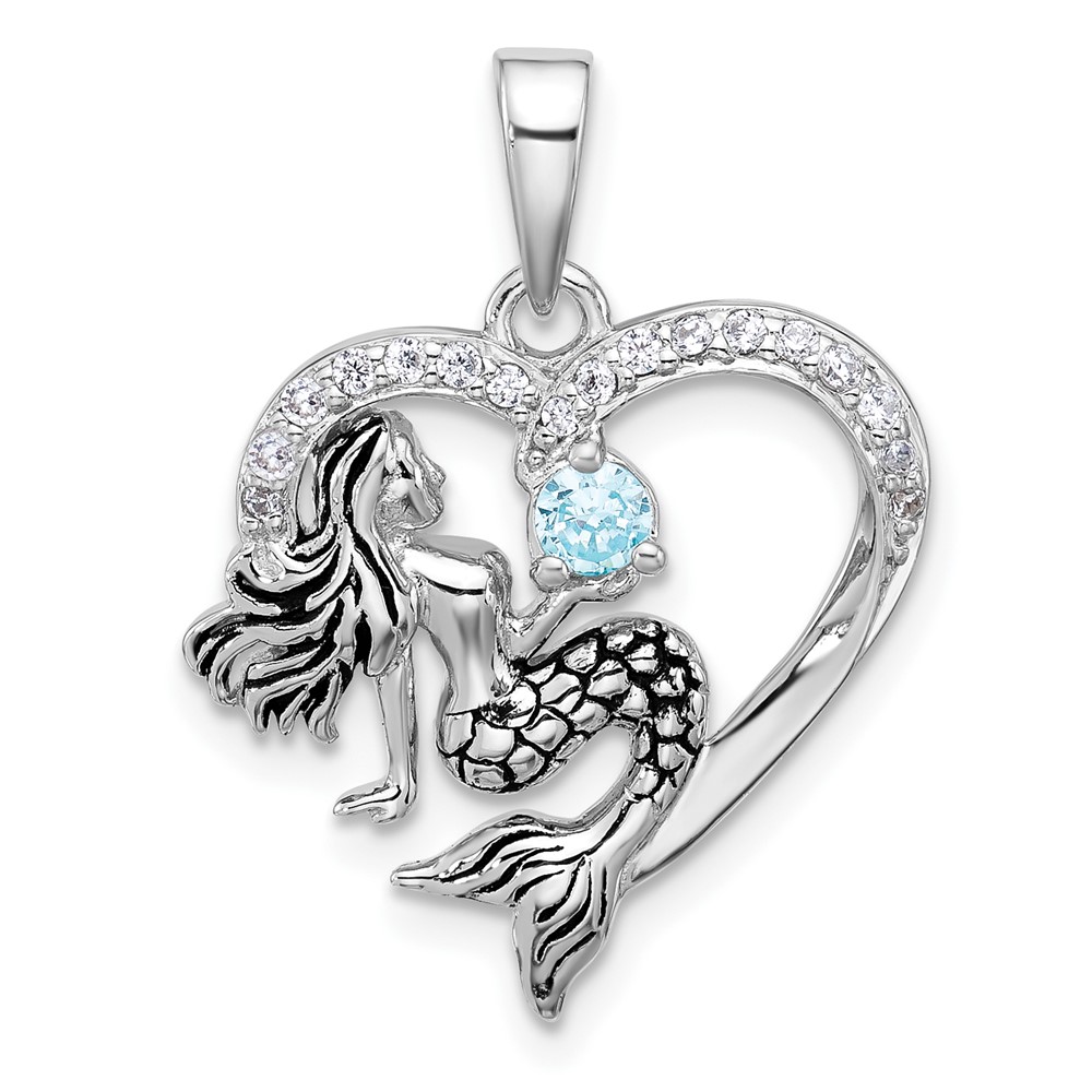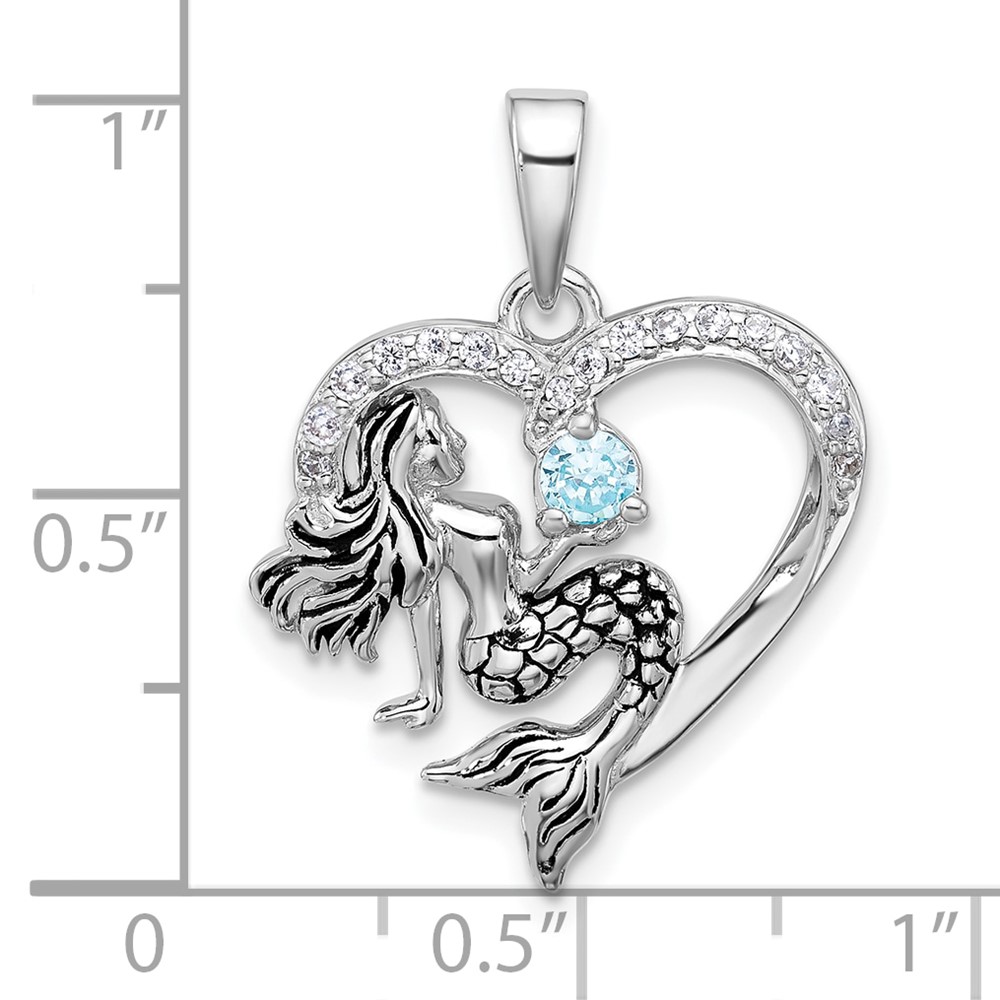 Sterling Silver Rhodium-plated Polished and Antiqued Blue CZ Mermaid Heart Pendant