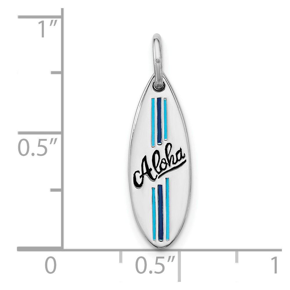 Sterling Silver Rhodium-plated Polished Blue and Black Enamel Aloha Surfboard Pendant