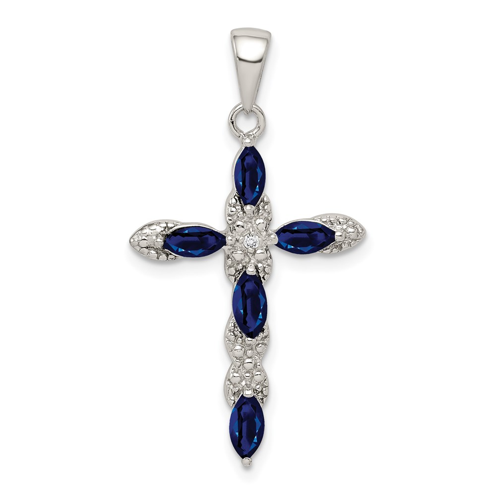 Sterling Silver Rhodium-plated Sapphire and Diamond Cross Pendant