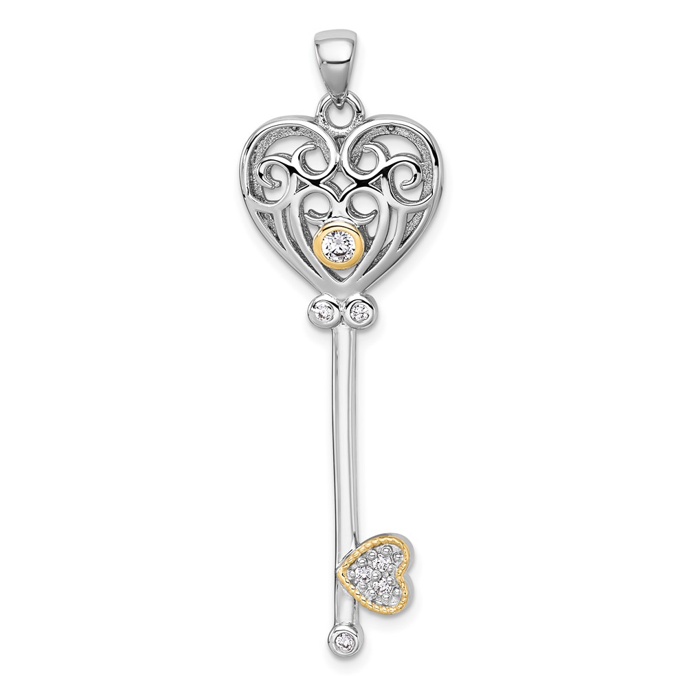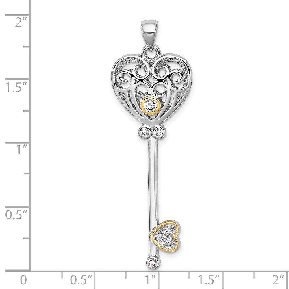Sterling Silver Rhodium-plated with 14k Accent Polished CZ Filigree Heart Key Pendant